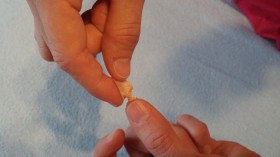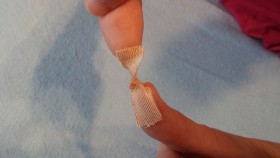 Nyní je třeba vytvořit z ní „mašličky“ a správně je nalepit na ránu. A jak vyrobit „mašličku“? Jednoduše vystřihněte obdélníček o rozměru 0,7 cm × 2–2,5 cm. Dále přetrhněte papír v prostředku a uprostřed obdélníčku otočte tape 2× kolem podélné osy. Vytvoří se tvar mašle.
