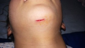 Zde je ukázka jednoho takového případu, při kterém nebylo nutné ránu sešívat. Na fotografii jsou po rozseknutí vidět bílé skvrnky – podkožní vazivo a tuk. Tkáň je červená.
